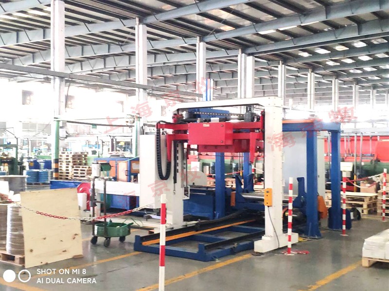 工作流程:工件由翻轉(zhuǎn)機(jī)輸送輥送入纏繞機(jī)包裝工位,由護(hù)輥進(jìn) 行自動(dòng)定位,提前放紙,機(jī)械手自動(dòng)上紙,纏繞機(jī)機(jī)身根據(jù)工件大小 自動(dòng)定位中心,根據(jù)不同工件尺寸自動(dòng)纏繞包裝,纏繞機(jī)工作結(jié)束后 由輥筒輸送回翻轉(zhuǎn)機(jī)。